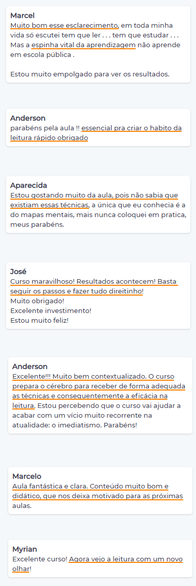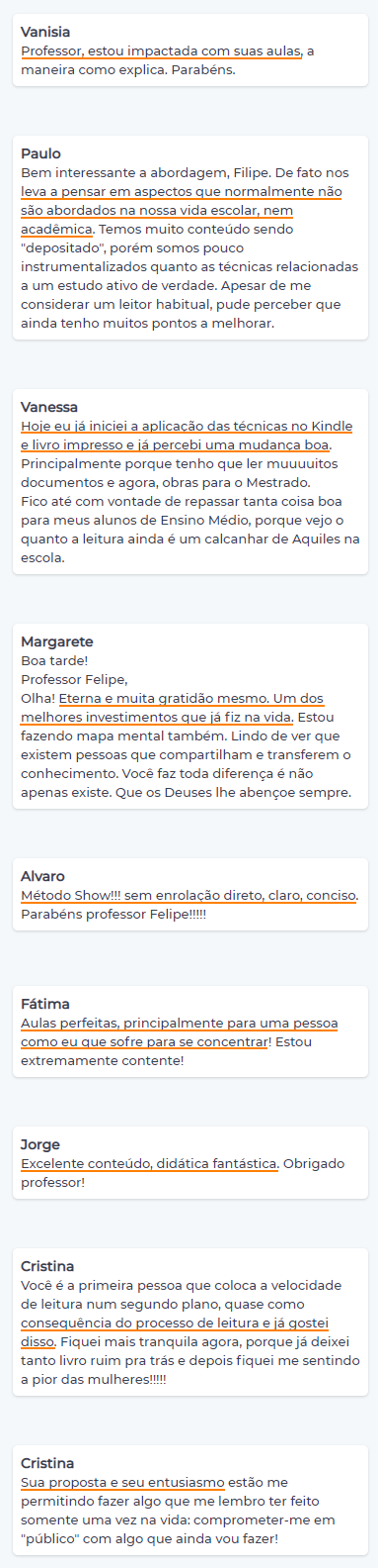 Apresento para você o curso online Leitura Eficaz. Um método que já ajudou mais de 7.838 alunos e pode ser aplicado em qualquer tipo de leitura, como: Livros, ebooks, apostilas e textos complexos.